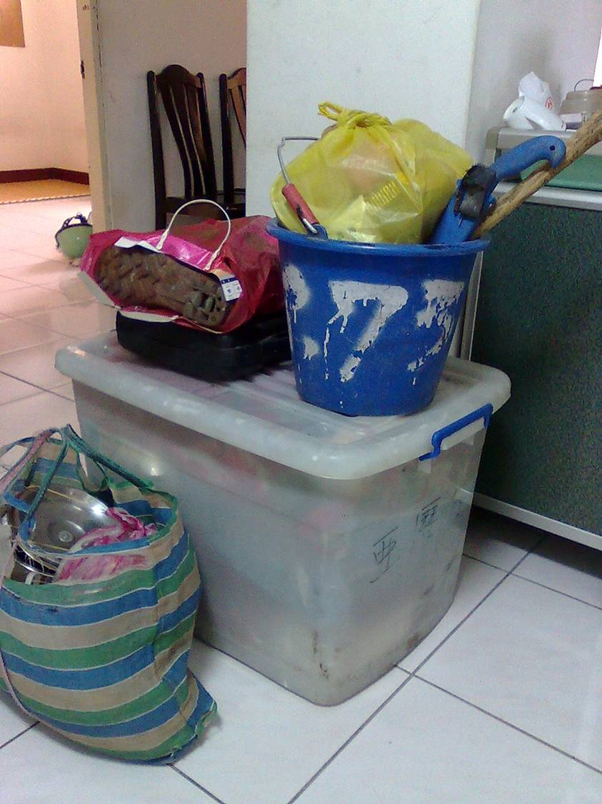 (爸爸的家當,雨鞋、醫藥包、卡式爐、鍋具, 箱子裡是換洗衣物與棉被。 攝影/lisin)